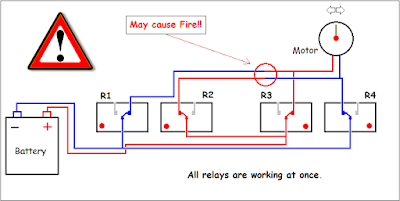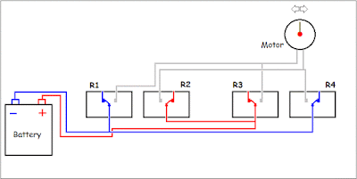 Well, this one is bit complicated. First you need to divide 4 relays into two and two. Then join both COM pins of relay1 and relay4 and connect it to nagative of the battery. Then join both COM pins of relay2 and relay3 and connect it to positive of the battery. Now join NO pin of relay1 and NO pin of relay3 and connect it to motor. That's one moto wire). And join NC pin of relay2 and NC pin of relay4 and connect it to the motor. That's another wire of the motor, as shown in the picture below.