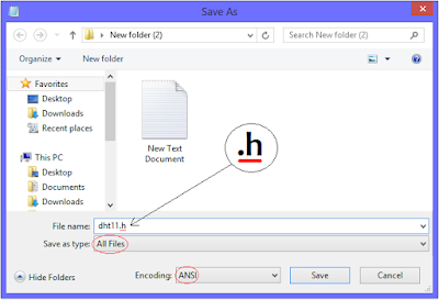 Step3:It's time to save the file so go to File > then click on Save As after clicking on save as you need to keep few things in your mind. Name the file, in this case dht11 and make sure you write .h at the end and file type should be All Files and the last thing choose Encoding as ANSI then click save. That's it you've made your .h file with Notepad.