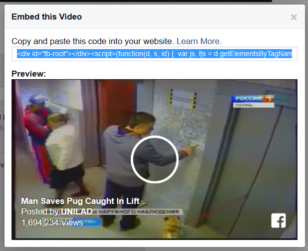 After clicking on "Embed Video" you will see a pop up page like the image below. Copy the code and paste it where ever you want on your page.