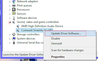 Step4: Click on the arrow next to the speaker logo, then right click on the Conexant SmartAudio HD and then click Update Driver software.
