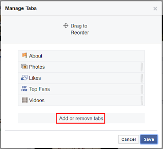 After clicking on the "Manage Tabs" it will pop up a small window where you will see a tab "Add or remove tabs" click on that.