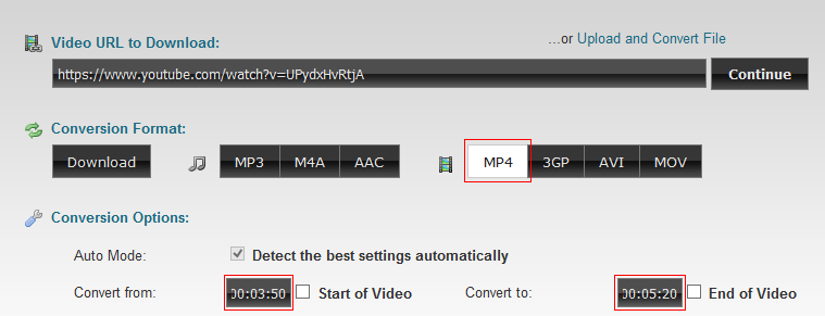 Choose the video format you like MP4, 3GP, AVI or MOV then choose where you would like the video to start from and where you like the video to end, and then click "continue".